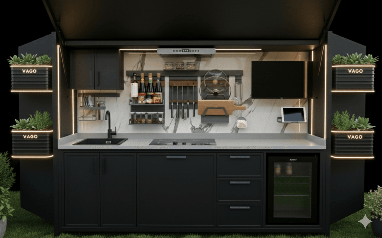Açık havada yemek pişirme keyfini, kapalı kabin sistemlerimizin sunduğu konfor ve düzenle birleştirin. Nomad ve Vago serilerimizin dayanıklı altyapısıyla tasarlanan dış mekan mutfak kabinleri; bahçe, teras ve veranda gibi alanları tam donanımlı birer yaşam alanına dönüştürüyor.