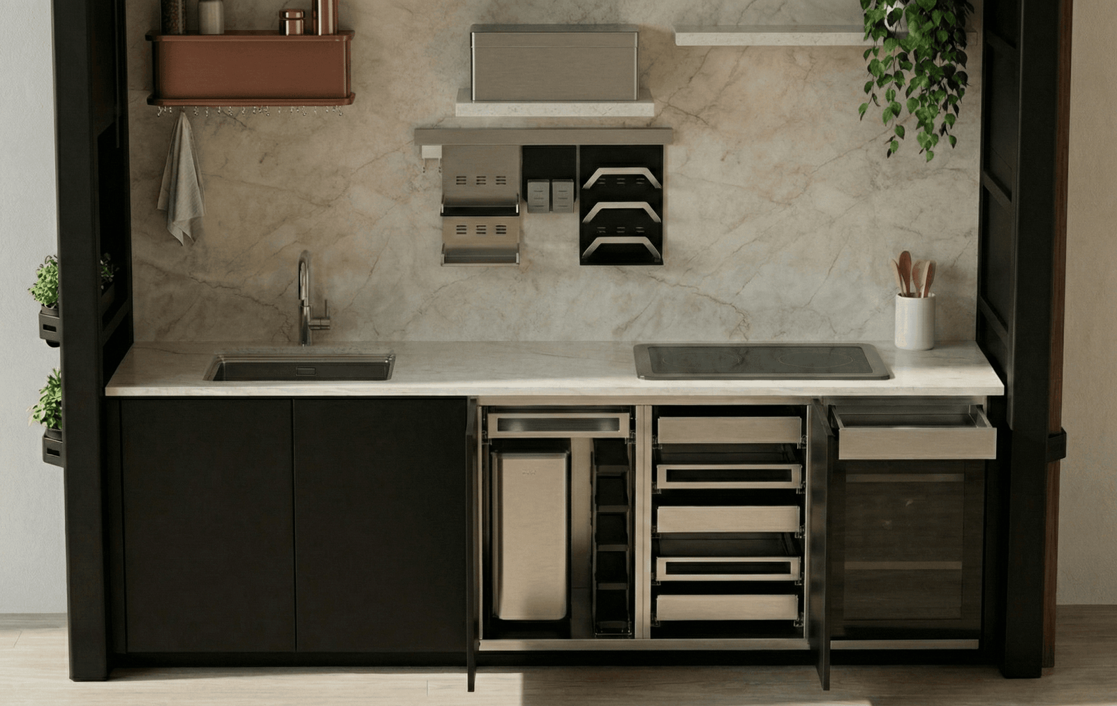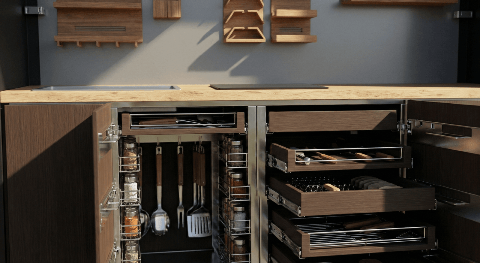 Özel üretim modüllerimizde sunulan organizer bölmeler ve yapılandırılabilir saklama alanları sayesinde, mutfak ekipmanlarınızı tamamen kendi kullanım alışkanlıklarınıza göre düzenleyebilirsiniz.