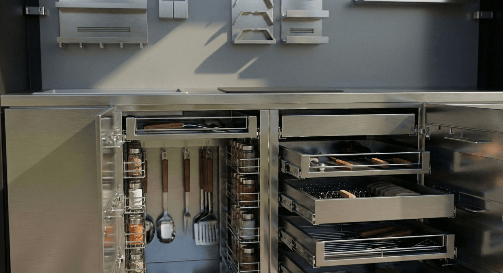 Düzensiz bir çekmece, yemek hazırlık sürecini yavaşlatır. Pro-kit, dış mekan mutfak ünitelerinizin iç hacmini en verimli şekilde kullanmanıza olanak tanıyarak şefliğinize odaklanmanızı sağlar. Kapalı mutfak sistemlerinde (Garden V) dışarıdaki şıklığı, çekmece içindeki profesyonel düzenle tamamlayın.